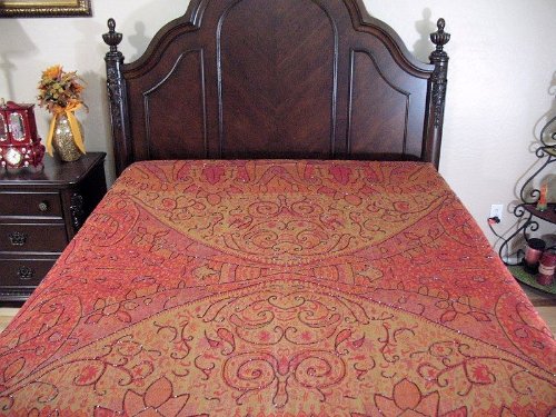 Incredible, amazing and RARE 100% Handwoven Jamavar 100% Wool Indian Bedspread Bedding Bedcover in exquisite huge floral and mughal paisley motifs with astonishing glass bead work and metallic gold thread embroidery from Kashmir, India: Size - Queen (88" X 104", with additional 3" fringes)or Use this as a Huge Bed, Furniture, Couch or Sofa Throw. NH9230 A stunning piece of workmanship that brings the creativity of the Kashmir artisans to the forefront! Jamavar fabrics are a legend in itself - famous & adored for their intricate weaves. Painstakingly hand loomed Jamavars have been hot fashion since centuries. You are looking at a very sophisticated & intricate Jamavar bedspread that would transform your bedroom. This Jamavar Wool bedspread is soft to touch and lightweight - a beautiful MUST HAVE decor item that signifies refinement, sophistication, durability and luster. Intricately detailed huge Floral and paisley motifs in Crimson and Taupe are elegantly intertwined and woven throughout - creating a warm & inviting blend of complimentary hues. Beautifully adorned with elaborate swirling Floral motifs, this bedspread of enchanting beauty is to be treasured. What makes this Bedspread so unique & special is the stupendous amount of intricate multicolored glass bead work all over. The paisley patterns have been enhanced & accented by rows of thousands of tiny Black, Gold & vibrant multicolor sparkling pipe beads and gold wire. Beads in Gold & multicolors adorn various motifs, while the gold wire embroidery highlights the motifs.With the help of tons of delicate glittering beads the artisans have elevated this masterpiece to the highest level by turning elaborate patterns into focal points.Each piece is unique and no two pieces will be the same. Imagine the painstaking labor involved - it takes weeks to produce such an heirloom, a perfect example of heavenly feel.Brighten your bedroom & transform your bed with the royal grandeur of Indian culture.